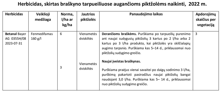 Pastaba.Herbicidu Betanal purkšti tik tada, kai po tarpueilių purenimo sudygsta nauja jaunų dviskilčių piktžolių banga. Šį purškimą galima kartoti 2–3 kartus kaip nurodyta lentelėje. Išpurškus herbicidą, tarpueilių nepurenti, kad nebūtų paskatintas naujai į dirvos paviršių iškeltų piktžolių sėklų dygimas.