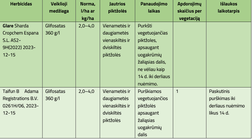 *Purškiant uogakrūmių pokrūmiuose herbicidus Glare Sharda ir Taifun B, kurių veiklioji medžiaga yra glifosatas, būtina žaliąsias augalo dalis ir jaunus ūglius apsaugoti nuo skiedinio, kad jis nepatektų ant jų.