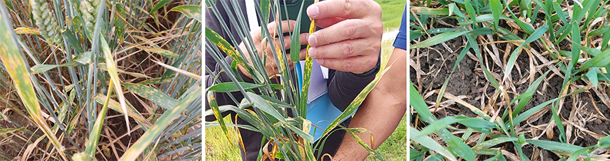 Kitos žalingos ligos – kviečių dryžligės – užkratas plinta oru, tačiau sporoms sudygti taip pat reikia drėgmės. Nuotraukoje – dryžligė atsėliuotuose Skagen veislės pasėliuose, Vilkaviškio r.