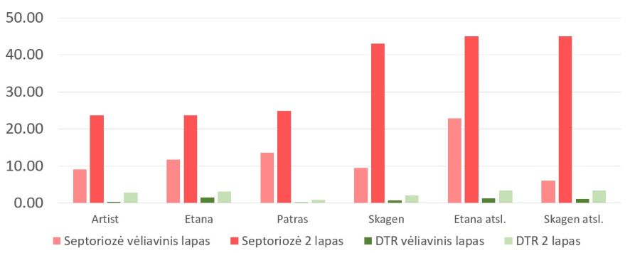 Taigi, praėjusiais metais visą birželį šilti, su gausiu lietumi orai buvo ypač palankūs intensyviam septoriozės išplitimui, išskyrus tik vakarinį pakraštį, kur lijo daug mažiau, nei visoje šalyje. Pietryčių ir centriniuose regionuose septoriozė smarkiai pažeidė viršutinius lapus jau žydėjimo tarpsniu (BBCH 65–69), o grūdo formavimosi tarpsniu (BBCH 73–77) tas pats atsitiko ir šalies šiaurėje auginamuose kviečių pasėliuose.