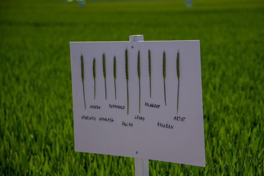 „Rapool-Ring“ pristatomų skirtingų kviečių veislių varpų kompozicija – hibridinių (pirmos 3 iš kairės) ir linijinių kviečių veislių varpos. Visas veisles ūkininkai pamatė ir gamybiniame bandyme.