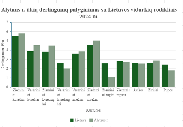 Pirmoje lentelėje pateikti 2022–2024 m. duomenys apie Alytaus r. augintų kultūrų derlingumą lyginami su Lietuvos ūkių derlingumu. Išanalizavę lentelės duomenis, matome, kad žieminių kultūrų, išskyrus žieminius rugius, vasarinius kvietrugius ir pupas, derlingumas 2024 m. šiek tiek didėjo arba išliko panašus, lyginant su 2024 m. Lietuvos respondentinių ūkių vidurkiu. Tam įtakos turėjo palankios meteorologinės sąlygos.