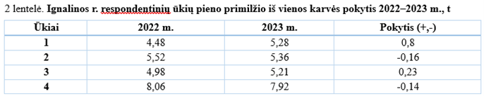 2023 m. lyginant su 2022, matome, kad pieno primilžis iš vienos karvės neženkliai mažėjo dviejuose ūkiuose ir neženkliai didėjo taip pat dviejuose. Šis rodiklis priklauso nuo ūkio stambumo. Kuo stambesnis ūkis, tuo primilžis iš vienos karvės didesnis.