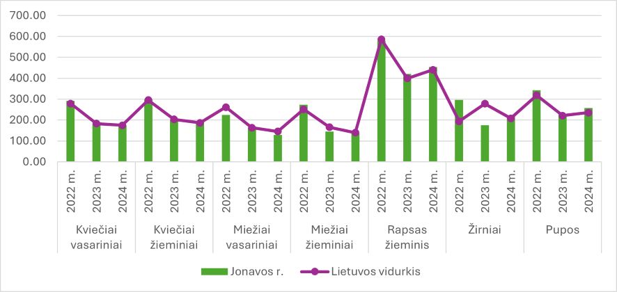 Analizuojant 1 pav. pateiktus 2024 m. ŪADT duomenis, matyti, kad Jonavos r. respondentinių ūkių augintų augalų derlingumai iš esmės buvo panašūs į Lietuvos respondentiniuose ūkiuose augintų derlingumo vidurkį. Bendra derlingumo dinamika rodo stabilumą ir veiklos efektyvumą, o kai kurių augalų derlingumas buvo didesnis nei Lietuvos vidurkis.
