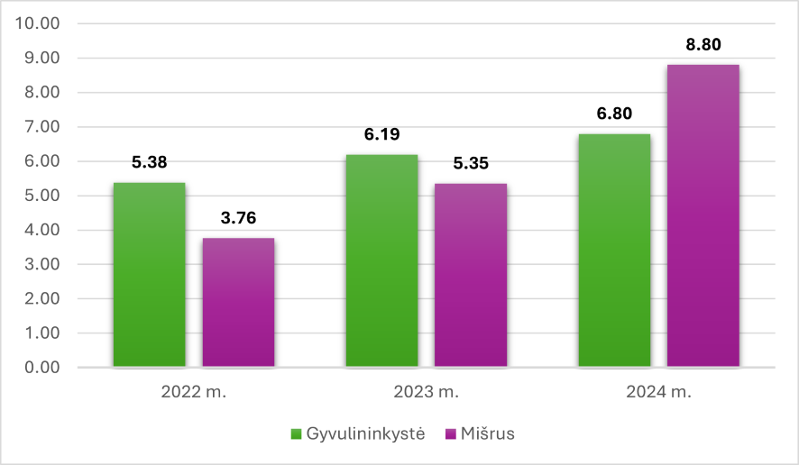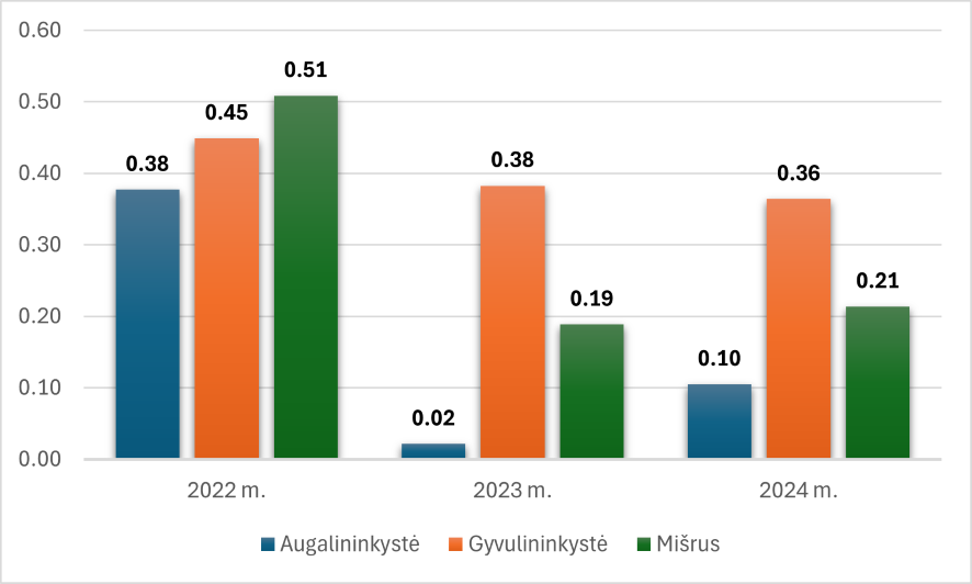Pieninės gyvulininkystės ūkiai atrodė stabilesni – 2022 m. rodiklis siekė 0,26, 2023 m. padidėjo iki 0,25, o 2024 m. kiek sumažėjo iki 0,16. Mišrūs ūkiai 2022 m. pasiekė aukščiausią rezultatą (0,49), tačiau vėlesniais metais pelningumas mažėjo ir 2024 m. siekė –0,02.