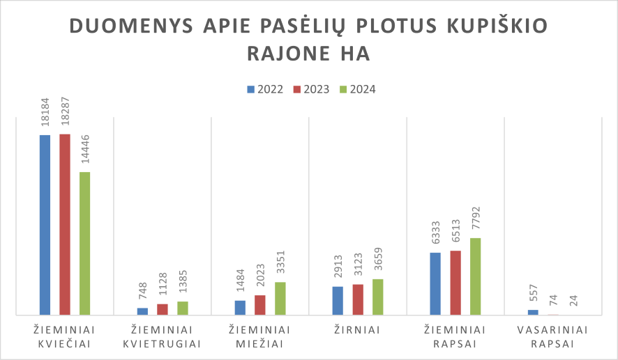 Šioje diagramoje yra pateikiami duomenys apie žieminių ir vasarinių pasėlių plotus ha 2022–2024 metų laikotarpiu. Matome, jog nuo 2022 metų Kupiškio rajone išaugo deklaruojamų žieminių miežių plotai. Žieminių miežių plotai 2022–2024 m laikotarpiu išaugo 2,3 karto. Tokį žieminių miežių augimą lėmė žieminių miežių gaunamas aukštesnis derlingumas, lyginant su vasariniais miežiais, bei pasirenkamos naujos žieminių miežių veislės.