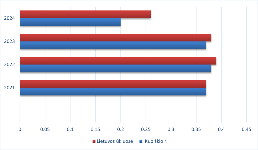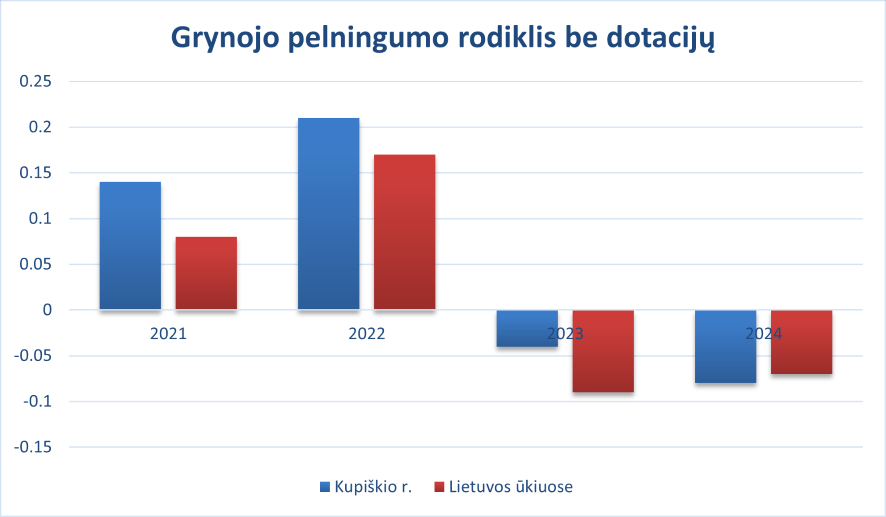 Matome, jog grynojo pelningumo rodiklis be dotacijų Kupiškio rajono ūkiuose augo 2021–2022 metų laikotarpiu, o 2024 metais, lyginant 2023 metais, sumažėjo ženkliai, lyginant su 2023 metais: šio rodiklio mažėjimas siekia 2 kartus. Lyginant su grynojo pelningumo be dotacijų rodikliu Lietuvos ūkiuose, 2024 metais šis rodiklis Kupiškio rajono ūkiuose 14 proc. žemesnis.