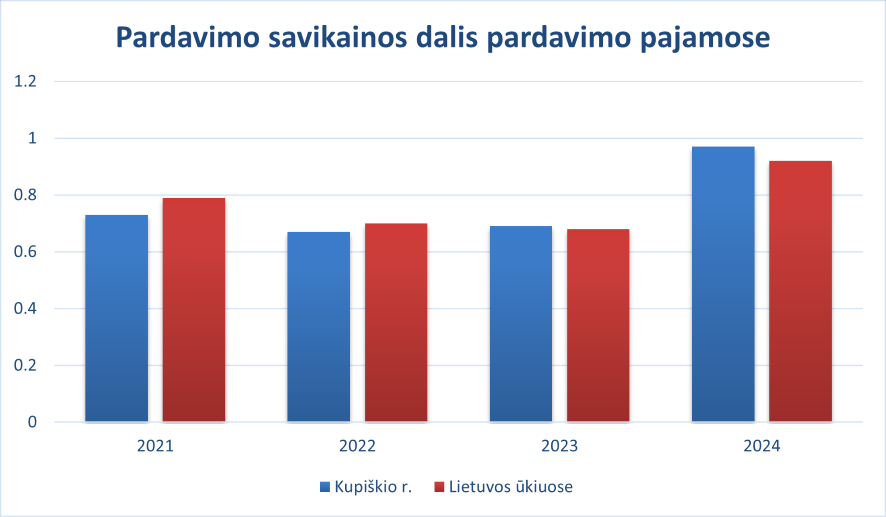 Pardavimo savikainos dalies pardavimo pajamose rodiklis Kupiškio rajono ūkiuose 2021–2022 m. laikotarpiu mažėjo, o 2024 metais, lyginant su 2023 metais, išaugo daugiau nei 40 proc. Tai rodo, jog savikaina Kupiškio rajono ūkiuose 2024 metų laikotarpiu augo. Matome, jog Kupiškio rajono ūkininkai žemės ūkio produkciją 2024 metais gamino 40 proc. brangiau nei 2023 metais. Lyginat šį rodiklį 2024 metais su Lietuvos ūkių, Kupiškio rajono ūkiuose jis didesnis 5,4 proc.