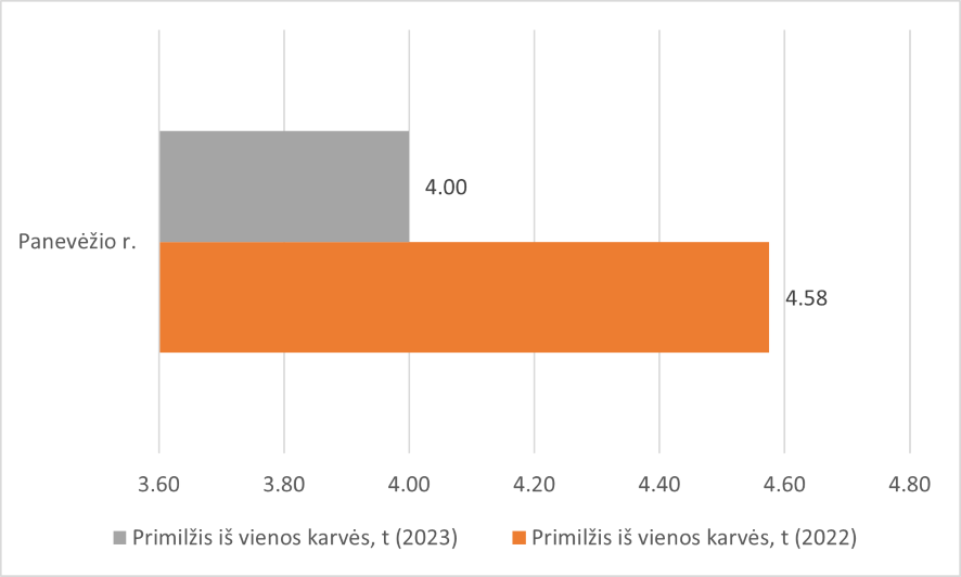 Iš diagramos matome, jog 2023 metais, lyginant su 2022 metais, stipriai krito pieno kaina. Tai turėjo įtakos gyvulių pardavimą, primilžio sumažėjimą.
