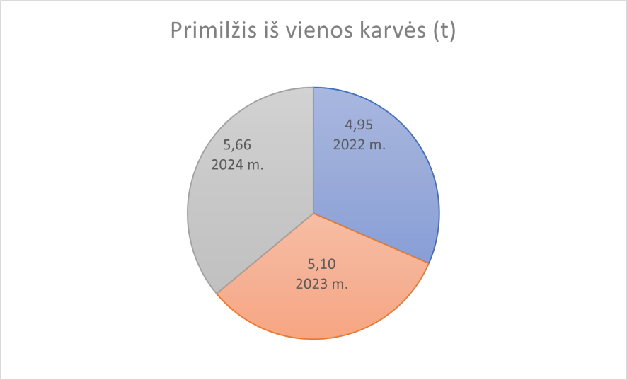 Remiantis pateikta diagrama, įvertintas primilžis iš vienos karvės Šiaulių r. ūkiuose per trejus metus (2022– 2024 m.). Duomenys pateikti tonomis. Matyti, kad per nagrinėjamą laikotarpį karvių produktyvumas nuosekliai didėjo. Nuo 2022 iki 2024 m. vidutinis primilžis iš vienos karvės padidėjo apie 0,71 tonos. Toks augimas rodo, kad ūkiai gerina gyvulių laikymo, šėrimo ir priežiūros sąlygas, taip pat gali būti skiriami modernesni pašarų papildai ir šėrimo technologijos. Siekiant išlaikyti šią teigiamą tendenciją, rekomenduojama tęsti investicijas į karvių sveikatos priežiūrą ir šėrimo kokybės gerinimą.