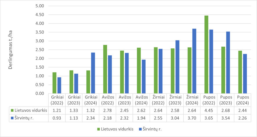 Kiek prastesnė situacija su pupomis, lyginant 2023–2024 metus. Jei Širvintų r. 2023 m. derlingumas siekė 3,54 t/ha, tai 2024 m. tik 2,26 t/ha. Nors šis kritimas yra ženklus, verta atkreipti dėmesį, kad panaši tendencija fiksuota ir visos Lietuvos mastu, kur vidutinis pupų derlingumas 2024 m. buvo tik 2,44 t/ha. Tai leidžia daryti prielaidą, jog derlingumo kritimą lėmę bendros klimato sąlygos, kurios paveikė visus šalies ūkius, o ne tik Širvintų regioną.