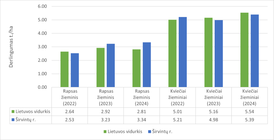Širvintų r. ūkiai 2024 m. išsiskyrė gerais žieminių rapsų derlingumo rodikliais, lenkdami šalies vidurkį tiek 2023, tiek 2024 metais. Tuo metu žieminių kviečių derlingumas nors ir didėjo, vis dar buvo šiek tiek mažesnis už pasiektą šalies ūkiuose.