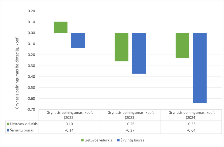 Grynojo pelningumo rodiklis be dotacijų aiškiai rodo, kad Širvintų r. ūkių priklausomybė nuo tiesioginių išmokų per metus padidėjo, ir rajono ūkiai yra ypač priklausomi nuo tiesioginių išmokų.