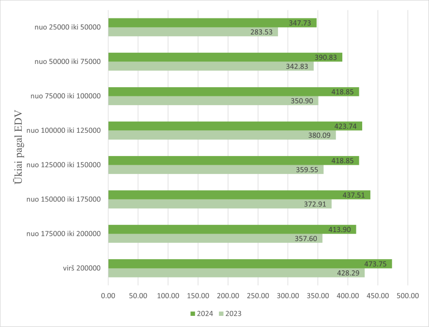 Pateiktoje diagramoje matome, kad visų ūkių pieno pardavimo kaina 2024 m. buvo didesnė, lyginant su 2023 metais. Pieno pardavimo kainos 2024 m. buvo didesnės ne tik Skuodo rajone, bet ir visoje Lietuvoje. Tokius pokyčius galėjo lemti padidėjusios gamybos sąnaudos – pašarai, kuras, energija. Kai šios brangsta, ūkininkai reikalauja didesnių supirkimo kainų.