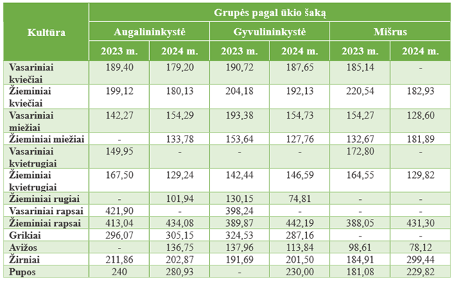 Kiekvieno ūkininko tikslas – maksimalios pajamos bei pelnas. Tai ūkio ekonominės veiklos rezultatas, išreiškiantis, kiek vertės ūkininkas sukūrė per tam tikrą laiką. Tai gali būti tiek pinigų įplaukos, tiek ir gauta produkcija ar paslaugos, turinčios piniginę vertę. Nors 2024 m., lyginant su 2023 m., pieno pardavimo kainos kilo, tačiau daugumos augintų kultūrų derliaus pardavimo kainos, buvo mažesnės. Lentelėje pateiktos 2023 ir 2024 m. grūdinių kultūrų pardavimo kainos pagal ūkio šakas (2 lentelė).