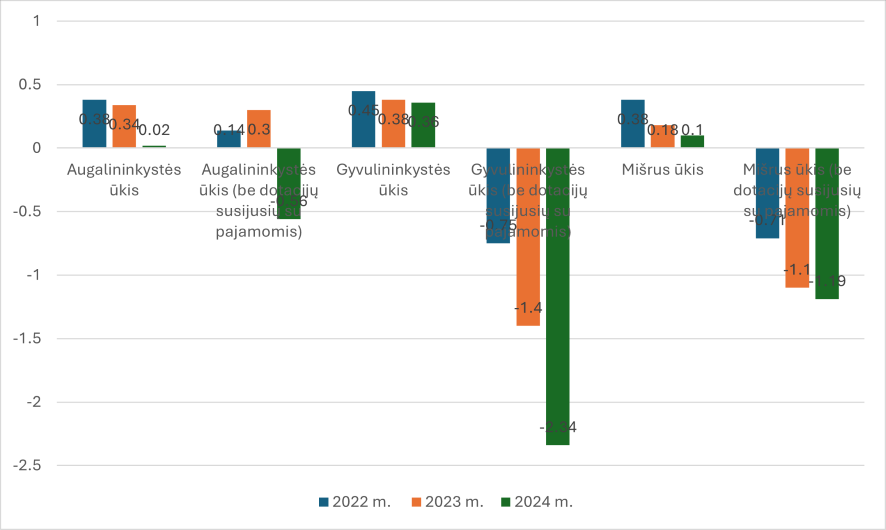 2024 m. pelningumo sumažėjimą lėmė didėjančios gamybos sąnaudos, mažėjusios žemės ūkio produkcijos supirkimo kainos ir nepalankios oro sąlygos, turėjusios įtakos derliui bei ūkių pajamoms. Dotacijos išliko pagrindiniu veiksniu, leidžiančiu išlaikyti ūkių veiklos stabilumą ir tęstinumą.