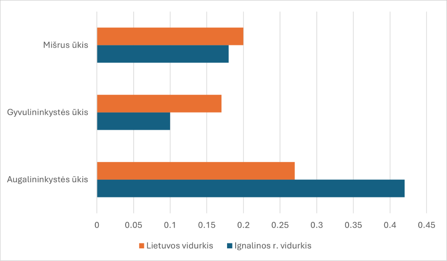 Ignalinos rajono augalininkystės ūkių skolos rodiklis 2024 m. buvo didesnis nei šalies vidurkis, o gyvulininkystės ir mišrių ūkių – mažesni už Lietuvos vidurkius. Tai rodo, kad augalininkystės ūkiai labiau rėmėsi skolintomis lėšomis, o kiti ūkiai išlaikė stabilesnę finansinę struktūrą (6 pav.).