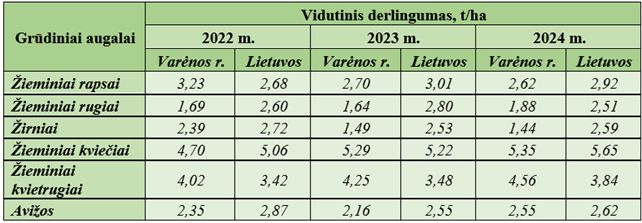Varėnos r. vyrauja augalininkystės ūkiai, kuriuose daugiausiai auginami tradiciniai grūdiniai augalai: rugiai, kviečiai, kvietrugiai, rapsai, avižos, žirniai. Lygindami rajono ūkių augalų derlingumą pagal VED su Lietuvos respondentinių ūkių derlingumo vidurkiu, matome, kad Varėnos rajone jis buvo mažesnis (žr. 1 lentelė). Mažą augalų derlingumą lemia tai, kad Varėnos r. priskiriamas prie didelio nepalankumo vietovių, žemės čia mažo derlingumo ir struktūros, taip pat įtakos turi nepalankios klimato sąlygos.