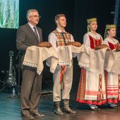 Iš LŪS pirmininko Raimundo Juknevičiaus rankų lietuviška ruginė duona įteikta (iš kairės): Anykščių r. savivaldybės merui Kęstučiui Tubiui, Seimo Kaimo reikalų komiteto pirmininko pavaduotojui Matui Skaramakui, LR Ministrui Pirmininkui Gintautui Paluckui, žemės ūkio ministrui Ignui Hofmanui.