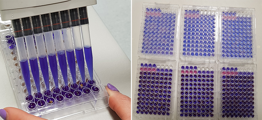 „Sėklų kokybės nustatymas susideda iš dviejų etapų: inkubavimo ir matavimo. Sėklos specialiose plokštelėse užpilamos atitinkamais kiekiais individualiu testų rinkiniu (reagentu), tuomet inkubuojamos. Šis procesas vyksta 21 ±2 oC aplinkos temperatūroje, tamsoje ir priklauso nuo sėklų. Pavyzdžiui, grūdinėms kultūroms jis trunka 4 valandas, žirniams –3. Po nustatyto laikotarpio inkubavimo plokštelės išimamos, tirpalai nuo sėklų pipetuojami į matavimo plokšteles. Sėklų gyvybingumą parodo tirpalo spalvos pokyčiai. Sakykime, balta spalva rodo, kad sėkla negyva, mėlyna – gyvybinga, o rausva – linkusi į senėjimą. Matuojame pavienių sėklų spalvos pokytį, kuris siejamas su daigumu. Vėliau, naudodami dirbtinį intelektą, prognozuojame šaknų dygimą, normalų ir nenormalų dygimą bei jo greitį“, – apie tyrimų niuansus pasakoja Lina Šmakovienė.