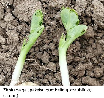 Pradėjome sėjamųjų žirnių pasėlių dinaminius stebėjimus. Šiais metais didžioji žirnių sėja vyko gegužės 1–5 dienomis. Stebimų pasėlių vyraujančios veislės: Respect (59 proc.), Salamanca (20 proc.), Navarro (6 proc.). Gumbelinių straubliukų (sitonų) pažeistų augalų rasta 50–100 proc.
