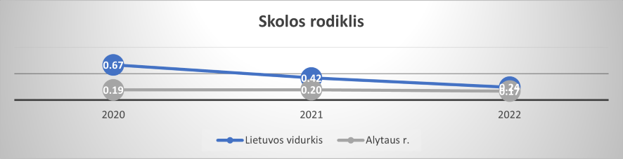 Skolos rodiklis. Kuo didesnis skolos rodiklis, tuo patiriama didesnė finansinė rizika, tuo sunkiau, susiklosčius nepalankioms sąlygoms, bus vykdyti prisiimtus įsipareigojimus ar gauti papildomą kreditą. Tačiau be skolintų lėšų dažnas ūkis negalėtų užtikrinti plėtros, įgyvendinti investicijų, susijusių su apsirūpinimu žemės ūkio, kitu turtu, didinančiais ūkio konkurencingumą rinkoje. Todėl skolintų lėšų naudojimas visada priimtas tol, kol nekelia grėsmės ūkio finansiniam stabilumui bei sklandžiai veiklai. Analizuodami Alytaus r. respondentų skolos rodiklį, matome, kad 2022 m. mūsų rajono respondentų skolos rodiklis mažesnis 10 proc., palyginti su 2021 m. Skolos rodiklis mažesnis ir Lietuvos mastu.