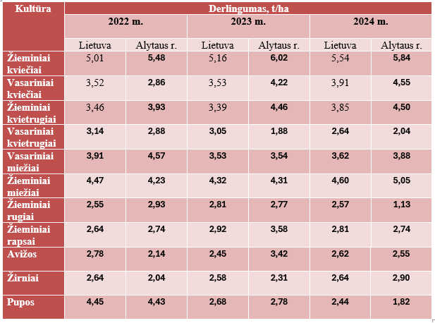 Pirmoje lentelėje pateikti 2022–2024 m. duomenys apie Alytaus r. augintų kultūrų derlingumą lyginami su Lietuvos ūkių derlingumu. Išanalizavę lentelės duomenis, matome, kad žieminių kultūrų, išskyrus žieminius rugius, vasarinius kvietrugius ir pupas, derlingumas 2024 m. šiek tiek didėjo arba išliko panašus, lyginant su 2024 m. Lietuvos respondentinių ūkių vidurkiu. Tam įtakos turėjo palankios meteorologinės sąlygos.