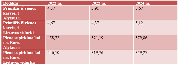 Alytaus rajone iš 27 respondentinių ūkių 18 ūkininkų laikė karves. Vidutinis pieno primilžis iš vienos karvės – 5670 kg per metus, lyginant su Lietuvos 2024 m. vidurkiu, pieno primilžis padidėjo 550 kg. Parduotos produkcijos vidutinė kaina 2024 m. buvo 379,86 Eur/t, taip pat, palyginus su Lietuvos vidurkiu, Alytaus rajono ūkiuose kaina buvo didesnė 20,59 Eur/t. Išanalizavus duomenis, galima daryti prielaidą, kad primilžių pokyčiai gali būti susiję su pašarų kokybe ir bandos valdymu.