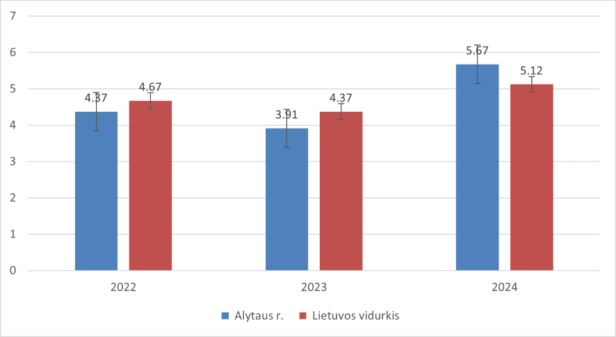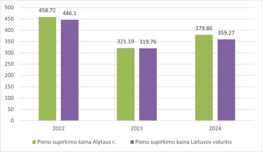 2 lentelė. Gyvulininkystės rodikliai Alytaus r. ir Lietuvos respondentiniuose ūkiuose 2022–2024 m.2 pav. Alytaus r. ir Lietuvos respondentinių ūkių primilžio iš vienos karvės vidurkio palyginimas, t