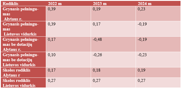 Grynojo pelningumo rodiklis rodo, kiek grynojo pelno uždirbo vienas pardavimo pajamų euras. Šis rodiklis apsiskaičiuojamas: grynasis pelnas dalinamas iš pardavimo pajamų ir pridedamos dotacijos, susijusios su pajamomis. Alytaus r. 2024 m. šis rodiklis buvo 0,23, Lietuvos vidurkis – 0,19. Grynojo pelningumo didėjimui įtakos turėjo grynojo pelno didėjimas, kurį lėmė padidėjusios pardavimo pajamos.