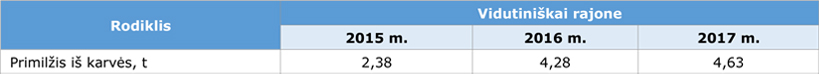Lygindami 2015 m. ir 2016 m. duomenis su 2017 m. duomenimis, matome, kad primelžto pieno kiekis iš karvės didėjo. Galima daryti prielaidas, kad 2017 m. geri ir sausi orai turėjo teigiamos įtakos gyvulių pašaro kiekiui ir kokybei.