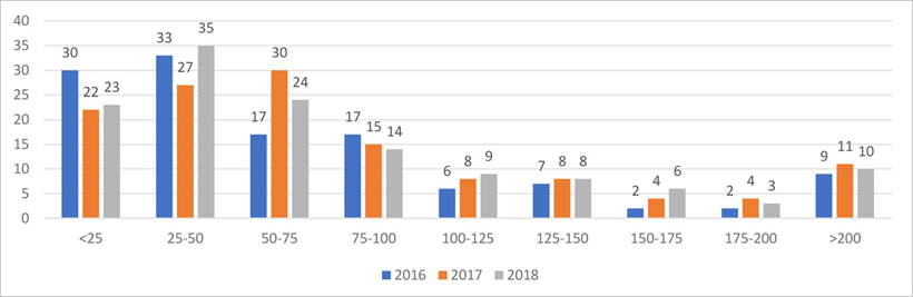 Daugelyje Mažeikių r. ūkių 2018 m., net 66 proc., SG buvo iki 10 (4 pav.). Keturiolikoje ūkių (11 proc. rajono ūkių) SG buvo nuo 10 iki 20. Keturių ūkių šis rodiklis viršijo 120. Taigi, Mažeikių r. ūkiai, užsiimantys gyvulininkyste, buvo smulkūs.