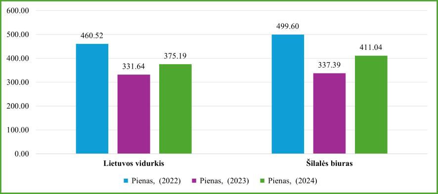 Kadangi rajone vyrauja pienininkystės ūkiai, svarbu apžvelgti pieno kainas lyginamuoju laikotarpiu. Džiugu, kad visais metais Šilalės r. pieno supirkimo kainos yra aukštesnės nei visos Lietuvos vidurkis. Rekordinės kainos stebimos 2022 m., kuomet vidutinė pieno tonos kaina buvo 499,60 Eur/t. 2023 m. kainos ženkliai krito iki 337,39 Eur/t ir vėl 2024 metais pieno supirkimo kaina augo iki 411,04 Eur/t. Pieno kaina Šilalės rajone buvo net 9,55 proc. didesnė už paskaičiuotą Lietuvos vidurkį.