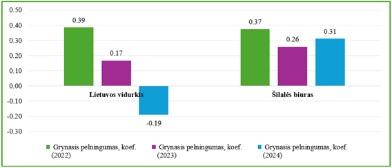 Iš pateikto grafiko matome, kad Šilalės r. vidutinis grynasis pelningumas 2022–2023 m. laikotarpiu nežymiai kito, lyginant su Lietuvos vidurkiu. Kiek ryškesnis skirtumas yra 2024 m., kuomet Lietuvos grynojo pelningumo vidurkis krito ir buvo nuostolingas, o Šilalės r. augo ir koeficientas siekė net 0,31. Galima pasidžiaugti, kad Šilalės r. grynojo pelningumo rodikliai 2023–2024 m. buvo žymiai didesni nei Lietuvos vidurkis. Dėl didesnių pieno supirkimo kainų analizuojamu laikotarpiu Šilalės r. ūkiai veikė pelningiau.