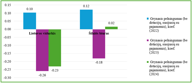 Pastarųjų trejų metų duomenys rodo, kad Šilalės r. ūkiai yra priklausomi nuo tiesioginių išmokų. 2022 ir 2024 m. grynojo pelningumo be dotacijų rodiklio reikšmė yra teigiama, ūkininkai dirbo pelningai, nes buvo gana aukštos produkcijos supirkimo kainos. 2023 m. sumažėjus pieno kainoms, padidėjus kintamoms išlaidoms, finansiniams įsipareigojimams grynojo pelningumo rodiklis Šilalės r. smuko iki -0,18. 2023 m. tapo išbandymu Šilalės r. ūkininkams. Subsidijos leido tęsti žemės ūkio veiklą ir ją plėsti.