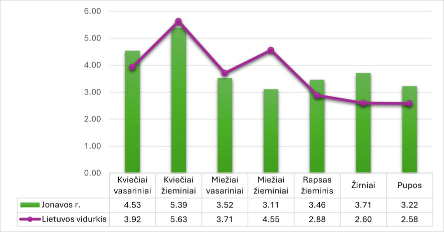 Analizuojant 1 pav. pateiktus 2024 m. ŪADT duomenis, matyti, kad Jonavos r. respondentinių ūkių augintų augalų derlingumai iš esmės buvo panašūs į Lietuvos respondentiniuose ūkiuose augintų derlingumo vidurkį. Bendra derlingumo dinamika rodo stabilumą ir veiklos efektyvumą, o kai kurių augalų derlingumas buvo didesnis nei Lietuvos vidurkis.