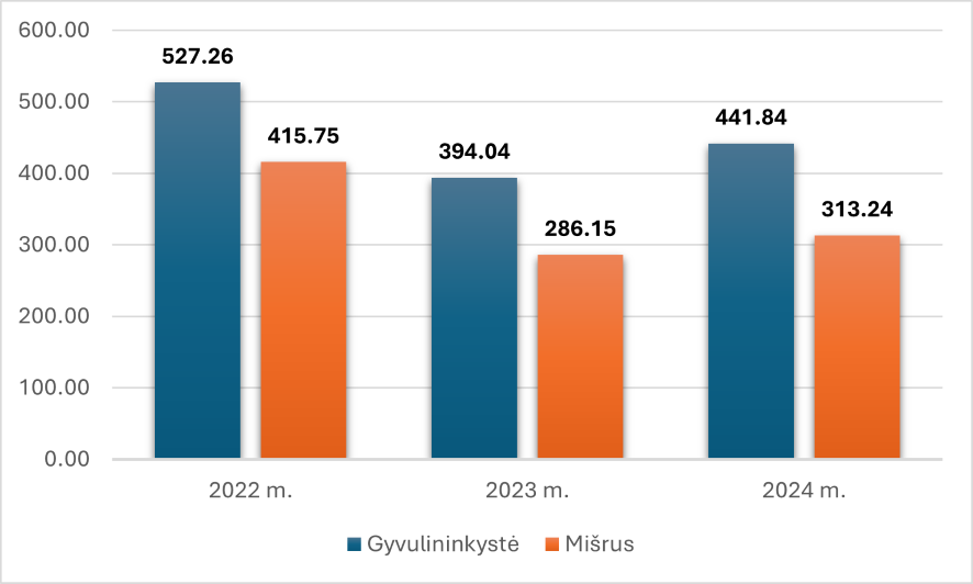 Mišriuose ūkiuose kainų kitimas buvo dar ryškesnis. 2022 m. už parduotą produkciją gauta vidutiniškai 415,75 Eur/t, 2023 m. – 286,15 Eur/t, o 2024 m. kaina siekė 313,24 Eur/t. Nors šie rodikliai mažesni nei pieninės gyvulininkystės ūkiuose, 2024 m. matomas nežymus kainų kilimas leidžia daryti prielaidą, kad mišrių ūkių veiklos stabilumas pamažu stiprėjo.