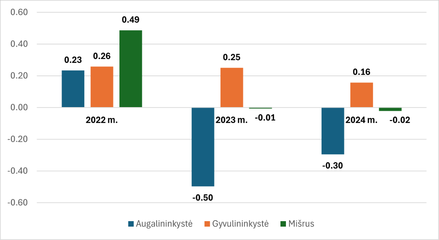Pieninės gyvulininkystės ūkiai atrodė stabilesni – 2022 m. rodiklis siekė 0,26, 2023 m. padidėjo iki 0,25, o 2024 m. kiek sumažėjo iki 0,16. Mišrūs ūkiai 2022 m. pasiekė aukščiausią rezultatą (0,49), tačiau vėlesniais metais pelningumas mažėjo ir 2024 m. siekė –0,02.