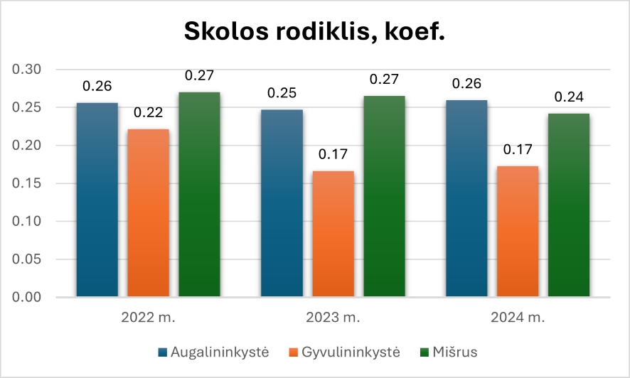 Augalininkystės ūkiuose skolos rodiklis 2022 m. siekė 0,26, 2023 m. sumažėjo iki 0,25, o 2024 m. grįžo į pradinį lygį – 0,26. Tai leidžia daryti išvadą, kad augalininkystės ūkiai išlaiko nuosaikų skolinimosi lygį ir vengia perteklinių finansinių įsipareigojimų.
