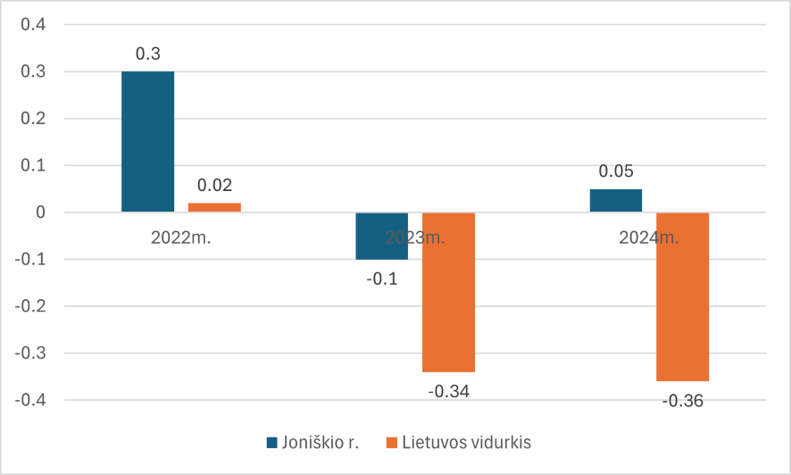 Lyginant Joniškio r. ūkius su visos Lietuvos, matyti, kad 2022–2024 m. laikotarpiu Joniškio r. ūkių šis rodiklis ženkliai geresnis nei Lietuvos vidurkis. Net 2023 m. Joniškio r. ūkininkai sugebėjo patirti mažiau nuostolių (-0,1), nors ir susidūrė ne tik su kainų kritimu, bet ir nepalankiomis oro sąlygomis, kai tuo metu Lietuvos vidurkis buvo -0,34. Joniškio r. ūkių grynojo pelningumo be dotacijų rodiklis 2024 m. siekė 0,05, o tuo metu Lietuvos respondentinių ūkių vidurkis vis dar buvo neigiamas ir siekė -0,36. Tai rodo, kad kitų rajonų ūkiai yra labiau priklausomi nuo išmokų nei Joniškio r., kurie geba prisitaikyti ir optimizuoti veiklą net ir kintant rinkos sąlygoms.
