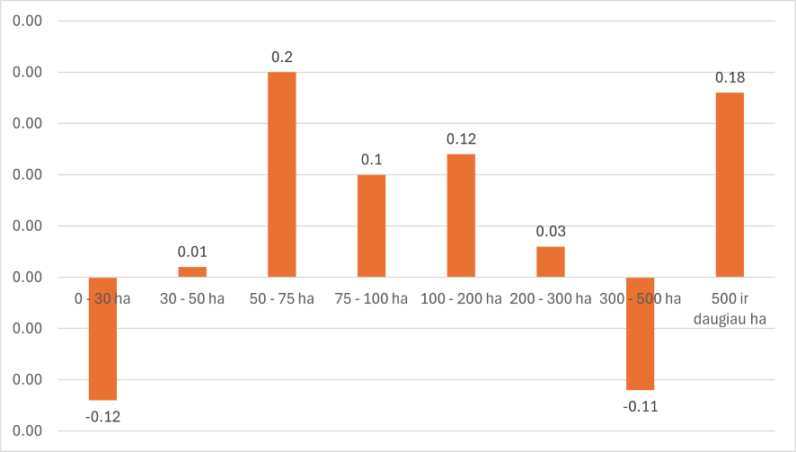 Taigi galima teigti, kad ūkių dydis nėra pagrindinis faktorius, lėmęs pelningumą Joniškio rajone 2024 metais. Grynasis pelningumas labiau priklauso nuo kitų veiksnių: ūkių valdymo, auginamų kultūrų pasirinkimo, išlaidų optimizavimo, rinkos sąlygų ir pan.