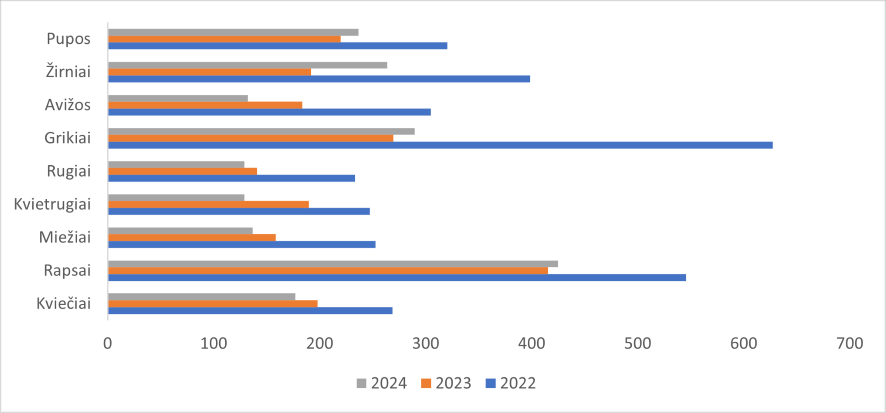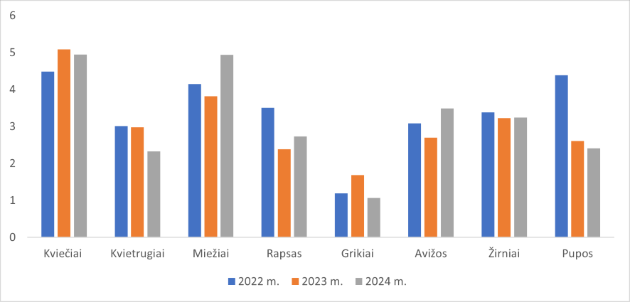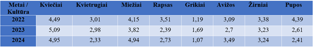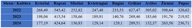 3 lentelė. Panevėžio r. respondentinių ūkių parduotos grūdinių kultūrų produkcijos kaina 2022–2024 m., Eur/t5 pav. Panevėžio r. respondentinių ūkių grūdinių kultūrų produkcijos kainos 2022–2024 m.