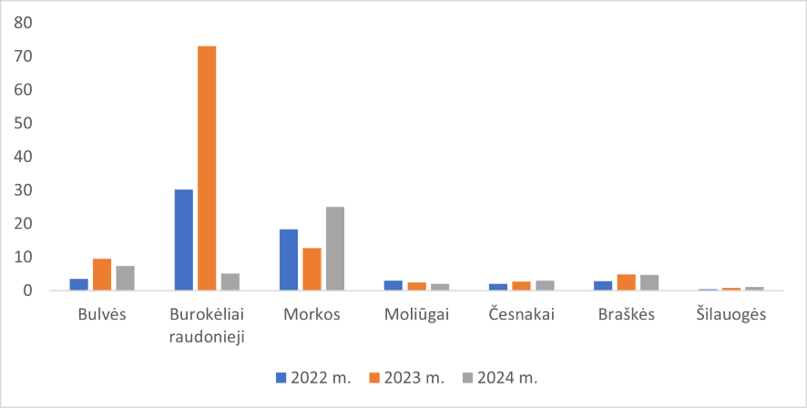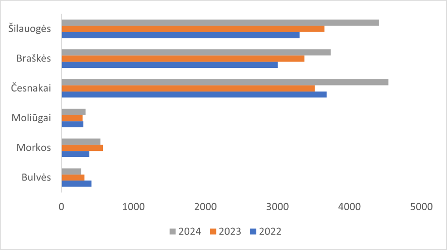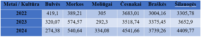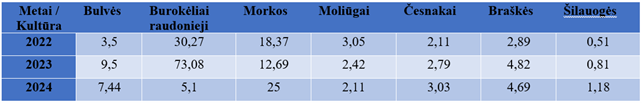 2 lentelė. Panevėžio r. respondentiniuose ūkiuose augintų daržovių ir uogų derlingumas, t/ha4 pav. Panevėžio r. respondentinių ūkių daržovių ir uogų derlingumas 2022–2024 m.