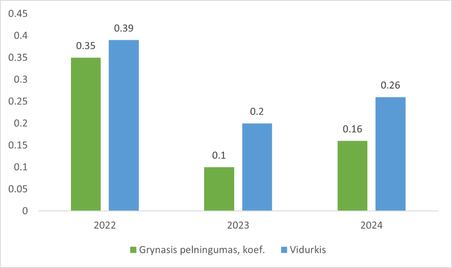 Atlikus respondentinių ūkių analizę matyti, kad 2024 m. grynasis pelningumas buvo 0,16, o visos Lietuvos mastu – 0,26. Panevėžio r. respondentų vienas pardavimo euras uždirbo 0,10 Eur mažiau pelno, nei visos Lietuvos respondentai. Tai lėmė kritusios augalininkystės produkcijos supirkimo kainos, išaugę gamybos kaštai bei mažesnė veiklos diversifikacija (mažesni ūkiai turėjo mažiau galimybių amortizuoti kainų svyravimus ir diversifikuoti pajamas, lyginant su didesniais šalies vidurkį lemiančiais ūkiais). Dalis ūkių investavo į technikos atnaujinimą ir aplinkosauginius reikalavimus, tačiau šios investicijos trumpuoju laikotarpiu sumažino pelningumą.