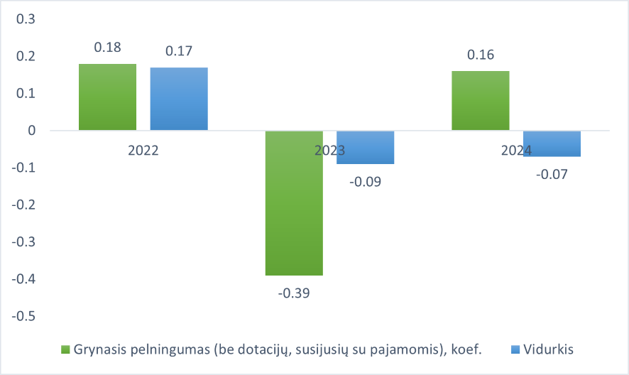 Grynojo pelningumo be dotacijų, susijusių su pajamomis rodiklis parodo, kiek grynojo pelno (be dotacijų, susijusių su pajamomis) uždirbo vienas pardavimo pajamų euras, t. y. parodo ūkio gebėjimą gauti pelną, negavus išmokų. Iš diagramos matyti, kad Lietuvos mastu 2023 m. laikotarpiu reikšmė yra neigiama, tačiau 2022 m. – teigiama, o 2024 m. Panevėžio rajono respondentinių ūkių grynojo pelningumo rodiklis (be dotacijų) yra teigiamas, nors bendras visos Lietuvos – neigiamas. Tai reiškia, kad 2023 m. Lietuvos ūkiai be tiesioginių išmokų būtų patyrę nuostolių, tik 2022 m. būtų pelningi ir be dotacijų. Panevėžio r. respondentų taip pat, kaip ir visos Lietuvos ūkių, 2023 m. reikšmė buvo neigiama, o 2022 ir 2024 m. teigiama, nors 2024 m. visos Lietuvos ūkių reikšmė neigiama. Apibendrinant, galima teigti, kad 2023 m. Panevėžio r. ūkiai buvo priklausomi nuo tiesioginių išmokų, tačiau 2022 ir 2024 metai buvo pelningi ir be jų.