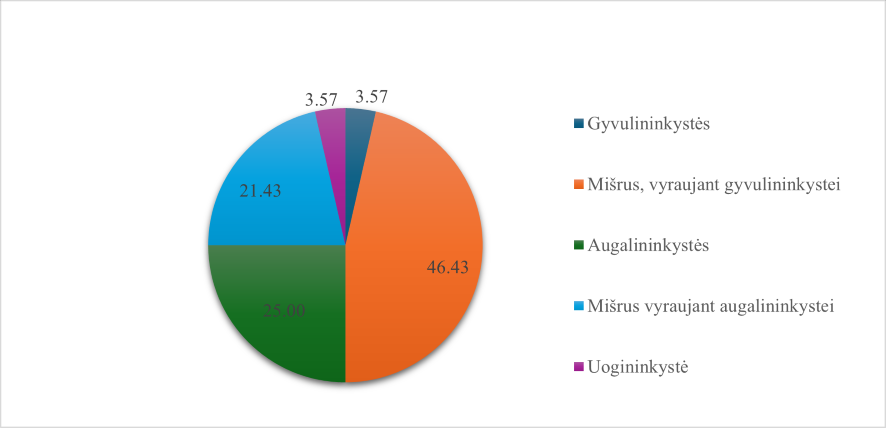 Prienų rajono respondentiniuose ūkiuose 2024 m. dominavo mišrūs ūkiai. Apie 46,43 proc. visų ūkių sudarė mišrūs, kuriuose vyravo gyvulininkystė, ir 21,43 proc. mišrūs ūkiai, kuriuose vyravo augalininkystė. Maždaug 25 proc. sudarė augalininkystės ūkiai, užsiimantys grūdinių kultūrų, rapsų ir ankštinių augalų auginimu ir tik po vieną ūkį iš visų analizuotų buvo gyvulininkystės ir uogininkystės sektorių ūkiai, kurie sudarė po 3,57 proc.