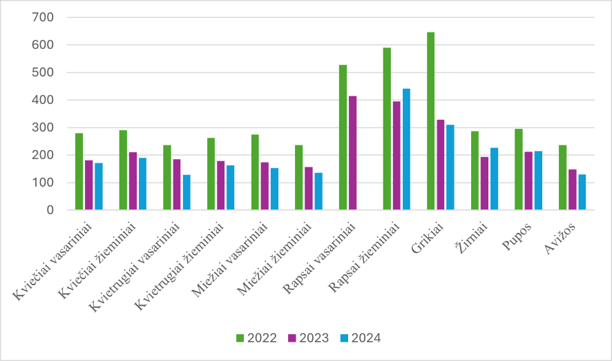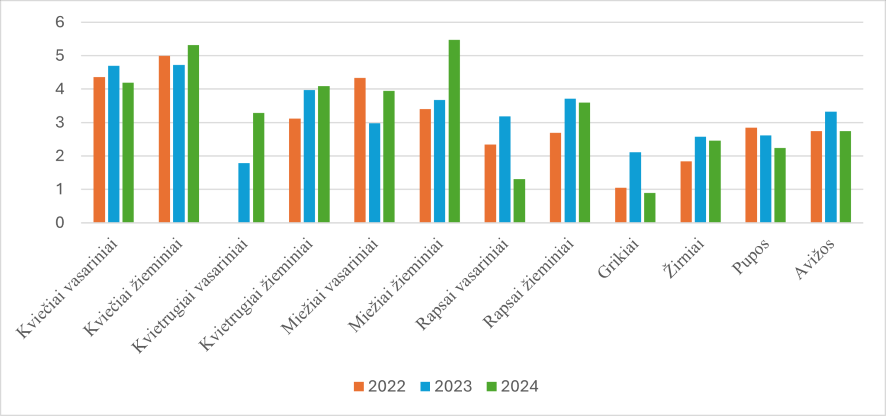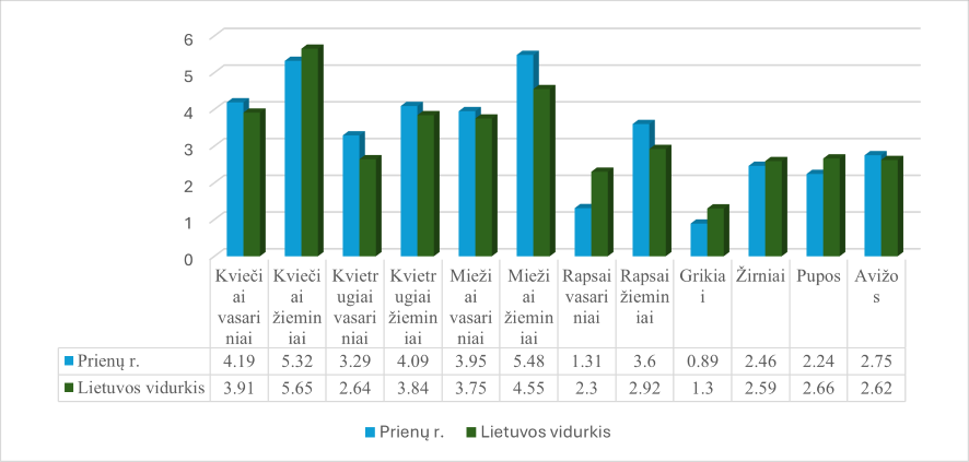 Prienų r. respondentinių ūkių daugelio grūdinių kultūrų derlingumas išaugo arba išliko stabilus, lyginant su 2022–2023 m., sumažėjo vasarinių rapsų (1,31 t/ha) ir grikių (0,89 t/ha) derlingumas. Nors orų sąlygos metų eigoje nebuvo itin palankios – pavasarį dalį pasėlių paveikė perteklinė drėgmė, o vasaros pradžioje pasitaikė sausringų laikotarpių, dauguma ūkininkų sugebėjo prisitaikyti, taikydami tinkamą tręšimo ir pasėlių priežiūros praktiką.