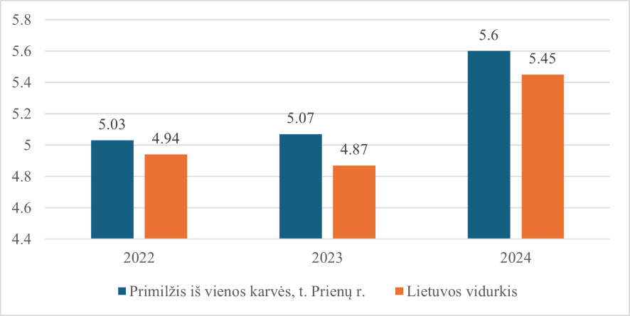 Vertinant 2024 m. Prienų r. pienininkystės ūkius, ŪADT duomenys rodo, kad dauguma respondentinių ūkių tęsė pieno gamybos veiklą, o jų produktyvumas kasmet augo, lyginant 2022–2024 metų duomenis. Vidutinis primilžis iš vienos karvės 2024 m. siekė apie 5,6 tonas per metus, o t. y. apie 10 proc. daugiau negu 2023 m. ir apie 3 proc. didesnis negu Lietuvos vidurkis. Kasmet didėjantį primilžį Prienų rajono pieno ūkiuose daugiausia lėmė gerėjanti gyvulių šėrimo kokybė ir modernesnės laikymo sąlygos. Daugelis ūkininkų pastaraisiais metais investavo į pašarų ruošimo techniką, melžimo įrangą, kurie leidžia tiksliau stebėti karvių produktyvumą bei sveikatingumą.