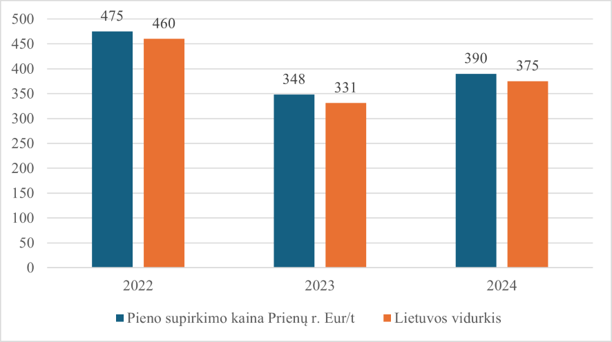 Pieno supirkimo kainos 2024 m. buvo šiek tiek aukštesnės nei 2023 metais. Vidutinė žaliavinio pieno kaina siekė apie 0,39 Eur/l, kai 2023 m. pieno supirkimo kaina buvo apie 0,35 Eur/l, o 2022 m. – apie 0,48 Eur/l. Lyginant su kitais rajonais, Prienų r. ūkių pieno supirkimo kainos kasmet apie 3–5 proc. yra didesnės už Lietuvos vidurkį. Nors 2024 m. pieno supirkimo kainų lygio, kuris buvo 2022 m., pasiekti ir nepavyko, o tai iš dalies sumažino ūkių pajamas, tačiau didesnis primilžis ir efektyvesnė gamyba padėjo daugeliui ūkininkų išlaikyti veiklos stabilumą.
