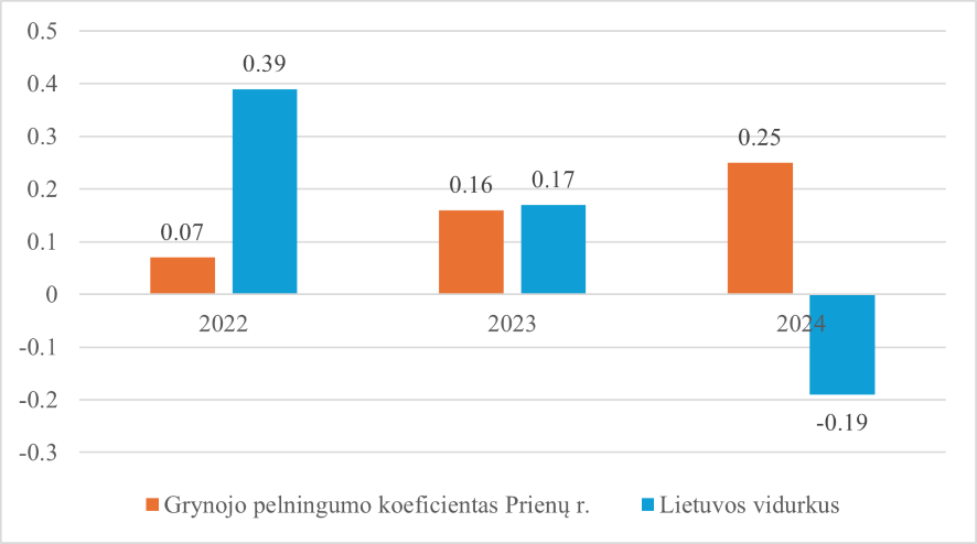 Vienas svarbiausių finansinių rodiklių – grynojo pelningumo rodiklis rodo, kiek vienas pardavimo pajamų euras uždirbo grynojo pelno. Prienų r. šis rodiklis siekė vidutiniškai apie 0,25, o 2022 m. – 0,07, 2023 m. – 0,16. Tai rodo, kad ūkininkai geba efektyviai valdyti sąnaudas ir užtikrinti teigiamą finansinį rezultatą net ir svyruojant produkcijos supirkimo kainoms. Aukštesnis pelningumas buvo fiksuotas gyvulininkystės ir mišriuose ūkiuose, ir ši tendencija išlieka nekintanti nuo 2022 m. Prienų r. ūkiams 2024 m. pavyko pasiekti didesnį rodiklį, lyginant su Lietuvos vidurkiu, kuris 2024 m. buvo neigiamas -0,19.